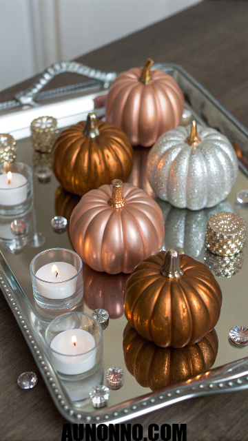 Group metallic pumpkins by finish or create an ombre effect using bronze, copper, and gold together. Add spray adhesive and glitter for extra sparkle if desired. These glamorous gourds elevate any space from casual to elegant and photograph beautifully for social media posts. They work year-round as decor since the metallic finishes do not scream Halloween or fall, making them versatile decorating investments.​