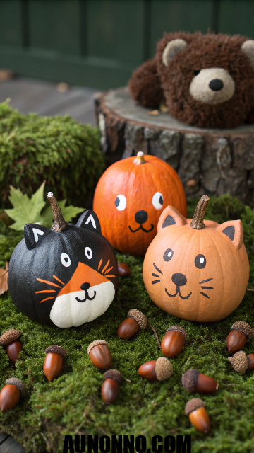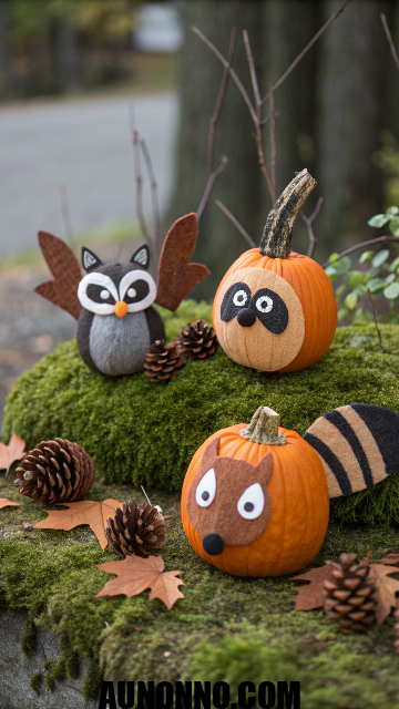 Turn mini pumpkins into adorable forest creatures using felt and paint. Paint your pumpkin in the base color of your chosen animal – brown for deer, grey for raccoons, or orange for foxes. Let the base coat dry thoroughly.​
