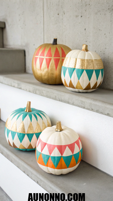 Use a small angled paintbrush to fill in the triangles with contrasting colors like gold, black, or bright accent shades. The geometric design can cover the entire pumpkin or create an artistic patch on one side. Erase any visible pencil marks once the paint dries completely. These contemporary pumpkins suit mid-century modern and minimalist home styles while bringing artistic sophistication to traditional fall displays.​