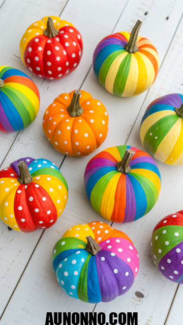 Rainbow pumpkins spread joy with their vibrant multicolor designs. Paint horizontal stripes in rainbow order around your mini pumpkin – red, orange, yellow, green, blue, purple. Use painter’s tape between colors for crisp lines if desired.​