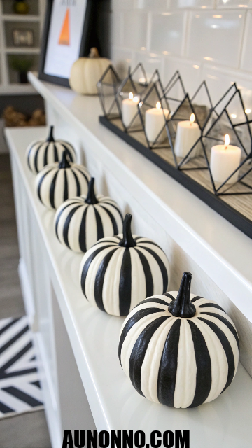 Paint the stem black for a cohesive finished look. This monochromatic design offers sophisticated simplicity that complements any color scheme. Stripe patterns work with various color combinations beyond black and white – try navy and gold for nautical vibes or pink and white for feminine charm. These versatile pumpkins transition easily from Halloween through Thanksgiving decorating.​