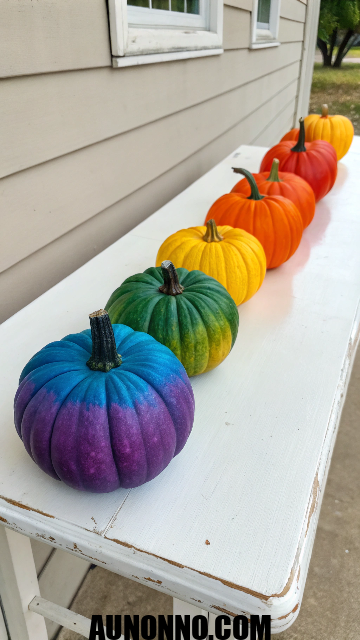 Create a stunning rainbow display with ombre-painted mini pumpkins. Select six to eight mini pumpkins and choose rainbow colors plus intermediate shades. Start with your darkest color and paint two pumpkins.​
