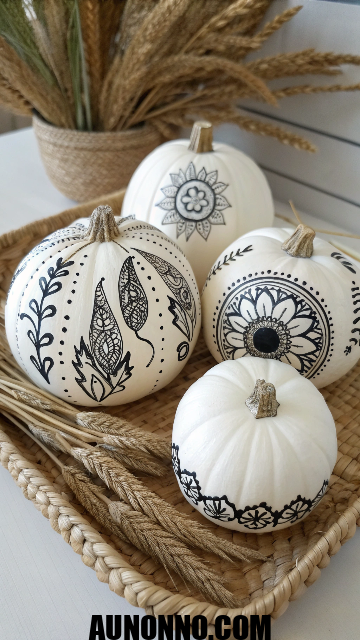 Henna-inspired pumpkins showcase intricate beauty with ethnic flair. Choose white or light neutral pumpkins for the best contrast with dark patterns. Use black paint pens or fine brushes with black acrylic paint.​