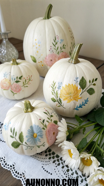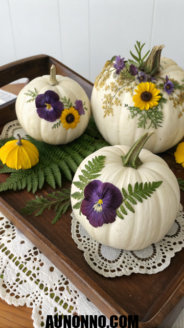 Pressed flower pumpkins combine natural beauty with artistic expression. Choose white or light-colored mini pumpkins for the best background. Purchase pressed flowers or create your own by pressing flat blooms like pansies, daisies, or cosmos in heavy books.​