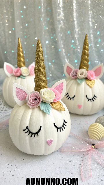 Paint two perfect pink circles on the front for rosy cheeks using a small round brush. Add closed eyelashes with black paint or a fine marker to create a sweet sleeping expression. Use additional glitter, foam flowers, or ribbons to decorate around the horn for extra sparkle. These fantasy-inspired pumpkins delight children and adults alike while bringing fairytale magic to seasonal decorating.​