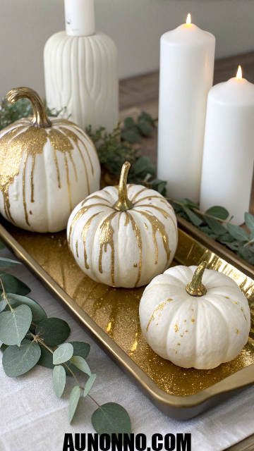Let the first coat dry, then apply a second for full metallic coverage. The irregular drip patterns add organic movement to the design. For extra dimension, use rose gold or copper paint instead of traditional gold. These elegant pumpkins elevate tablescapes for formal autumn dinners and look stunning when grouped with candles and metallic accents in your decor.​