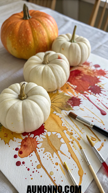 Watercolor pumpkins showcase artistic flair with their flowing organic patterns. Choose white or light-colored mini pumpkins as your canvas. Gather several colors of liquid watercolor or thinned acrylic paints in autumn shades.​