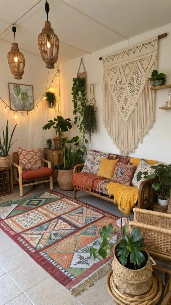 Use warm, earthy tones like terracotta, mustard, and olive green, complemented by neutral backgrounds. Lighting should feel soft and ambient—think lanterns, fairy lights, or paper lamps.