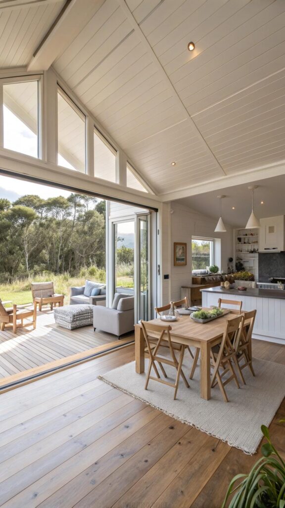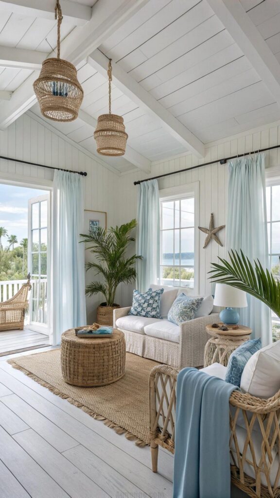 Wooden floors with a whitewashed or weathered finish amplify the coastal feel, while nautical-inspired décor such as rope accents or driftwood art adds personality. Wicker furniture or rattan pendant lights further enhance the beachy aesthetic.