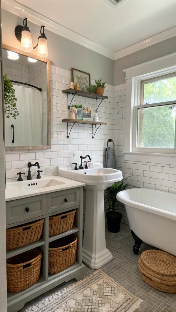 Maximize small spaces with smart storage solutions, such as wall-mounted cabinets or floating vanities. Add a vintage clawfoot tub for a luxurious touch, paired with modern fixtures like matte black faucets.