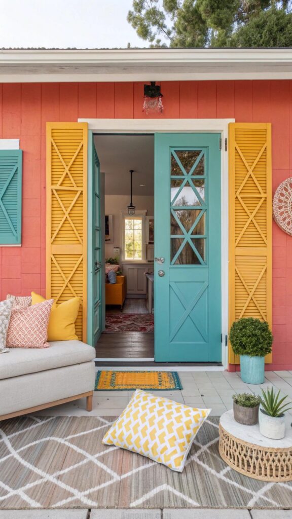 Use vibrant-colored front doors or shutters to give the exterior a cheerful touch. Inside, feature accent walls with bold wallpapers or paint in geometric patterns or florals.