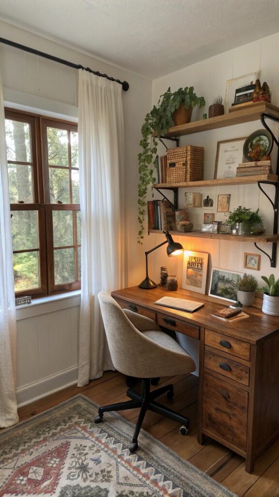 Use vintage desks or writing tables paired with modern ergonomic chairs for a blend of old and new. Incorporate floating shelves to maximize vertical space for books, plants, or decorative items.