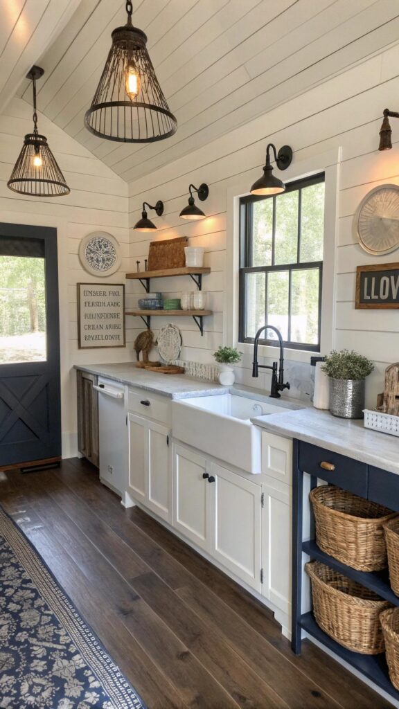 Blending farmhouse and cottage aesthetics creates a timeless yet modern home. Think shiplap walls, sliding barn doors, and farmhouse sinks, paired with updated lighting fixtures like industrial pendants or chandeliers.