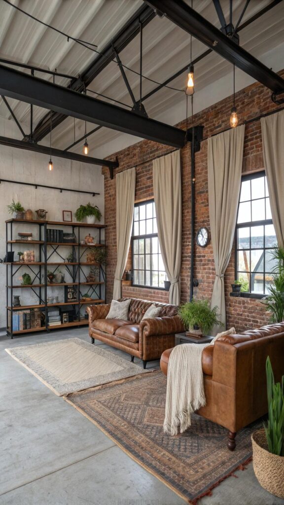 Open shelving with metal brackets is perfect for displaying curated items like books, pottery, or plants. Combine these industrial touches with natural textures like jute rugs or linen curtains to soften the look.