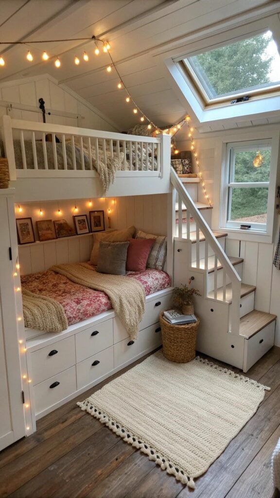 Lofted sleeping areas are both functional and whimsical, perfect for kids’ rooms or guest spaces.