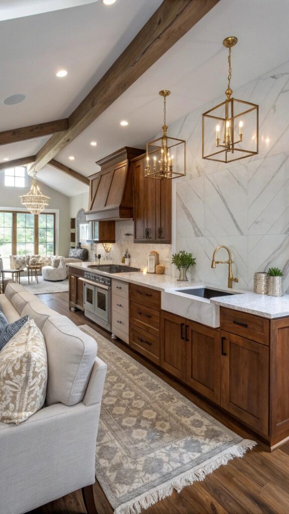 Add furniture that defines the different zones while keeping the flow intact. For example, a large kitchen island can separate the cooking area from the living room while providing additional seating. Statement pendant lighting above the island adds a touch of elegance.