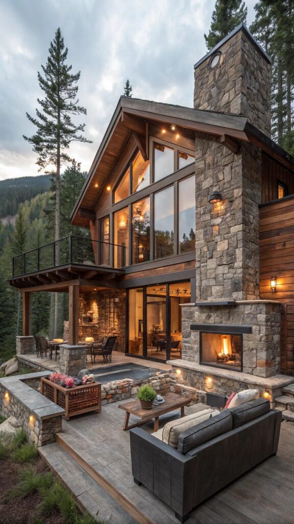 Outdoor spaces are crucial—think wraparound decks with fire pits or hot tubs. Choose hardy materials for exterior finishes, such as stone or cedar siding, to withstand mountain climates.