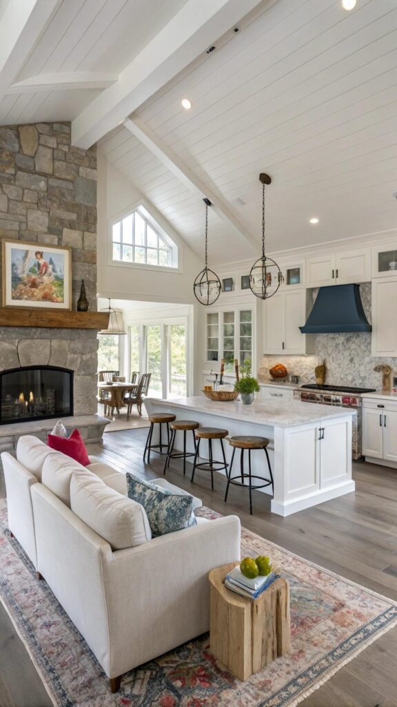 Choose a neutral color palette like whites, beiges, and greys to unify the open space, while pops of color can be added through soft furnishings or artwork. A mix of textures—such as plush rugs, stone fireplaces, and velvet cushions—adds visual interest without overwhelming the openness.