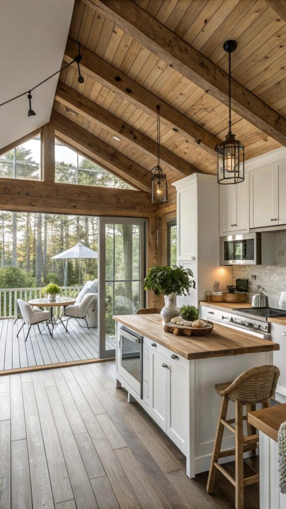 Combining rustic wood elements with sleek, minimalist lines creates a warm and modern aesthetic for cottage homes. Use reclaimed wood for beams, ceilings, or accent walls, paired with clean white or neutral-toned furniture to balance the rustic and contemporary vibes.