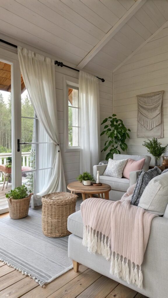 Furniture should be minimalist but comfortable, with clean lines and soft curves. Layer textures like wool throws, linen curtains, and plush rugs to create a snug yet uncluttered environment.