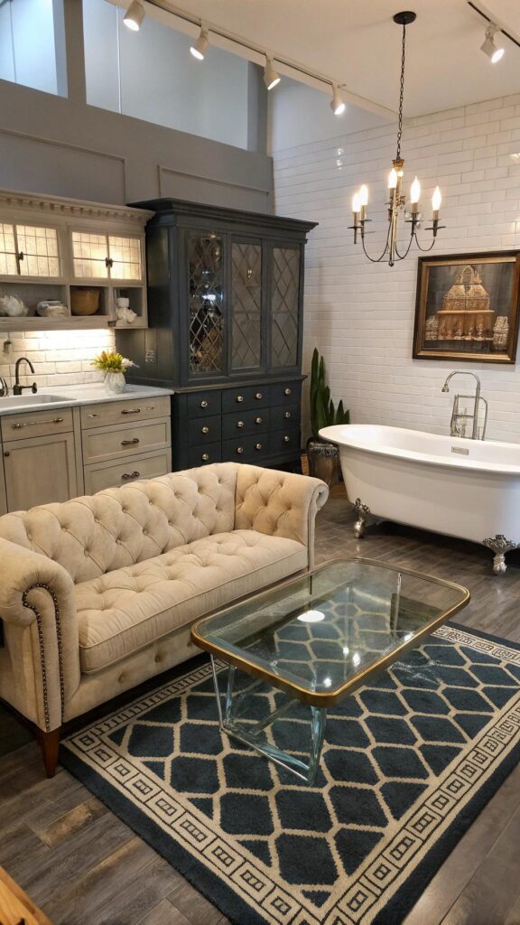 Merging vintage and modern styles gives cottages a unique, eclectic personality. Start with vintage furniture—such as tufted sofas, antique dressers, or clawfoot tubs—and pair them with modern elements like geometric rugs or sleek pendant lighting.