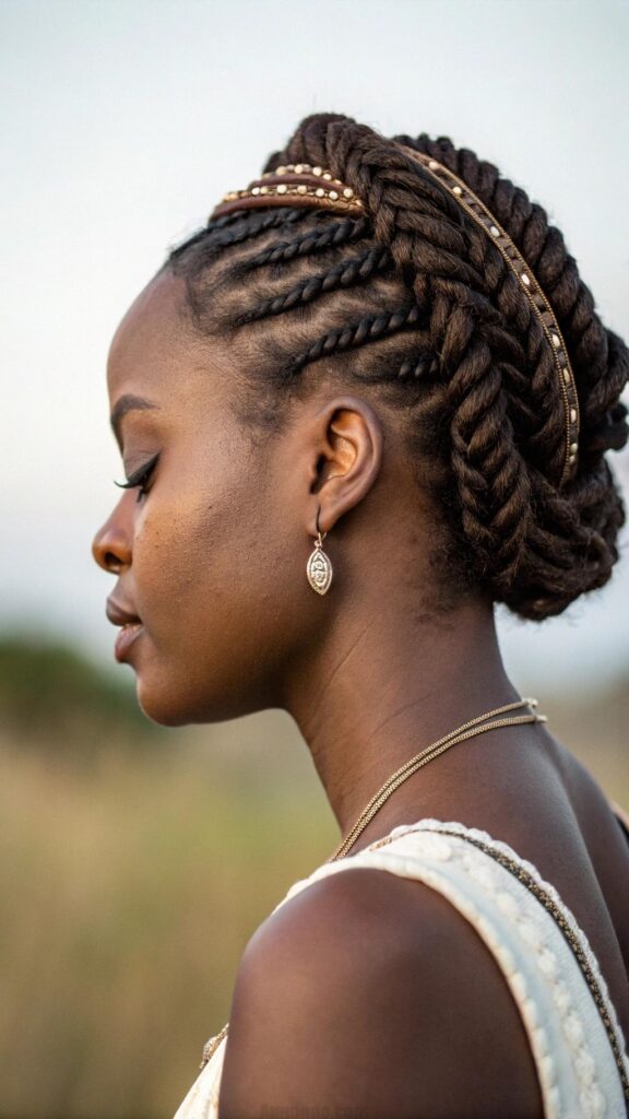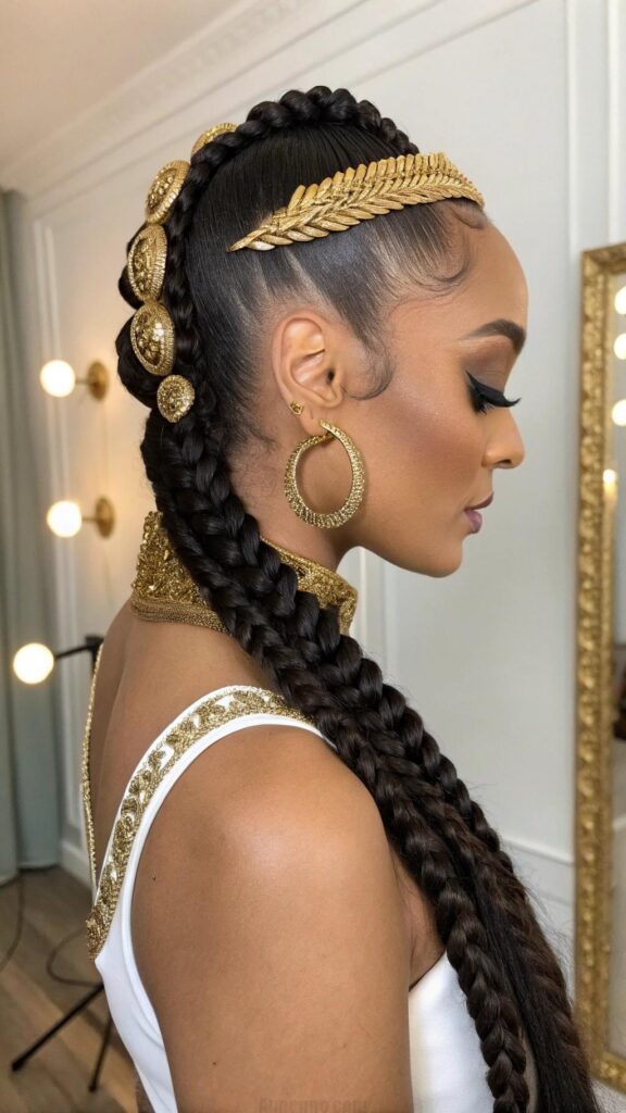 Goddess braids can be styled in various ways, from updos to half-up styles. They work well for all hair types and lengths. Add gold or silver cuffs for a regal touch.