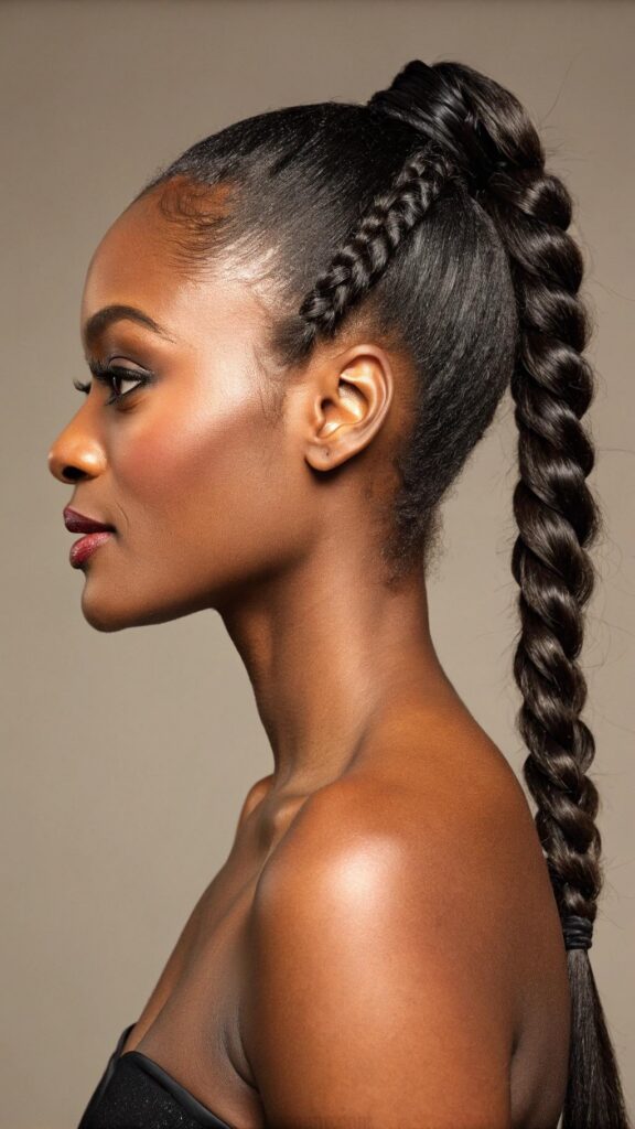 The braided ponytail works well for all hair types and lengths. It’s a versatile style that can be dressed up or down. Use accessories like beads or scarves to add a personalized touch.