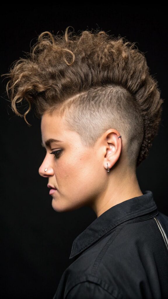 The curly mohawk works well for all hair types and lengths. It’s a versatile style that can be dressed up or down. Add accessories like beads or cuffs for a unique touch.