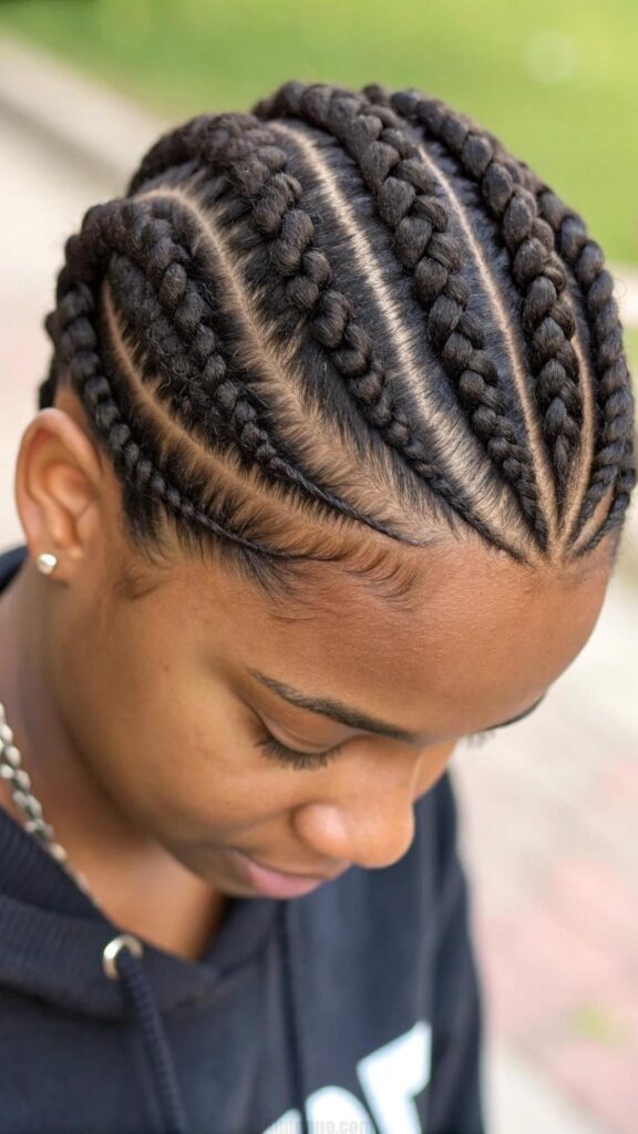 Cornrows are a traditional and versatile hairstyle that can be styled in countless ways. Braid your hair close to the scalp in straight or curved lines. This style is perfect for protecting your hair and keeping it neat.