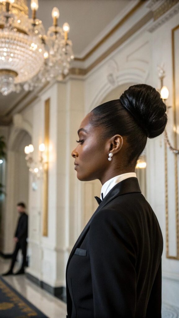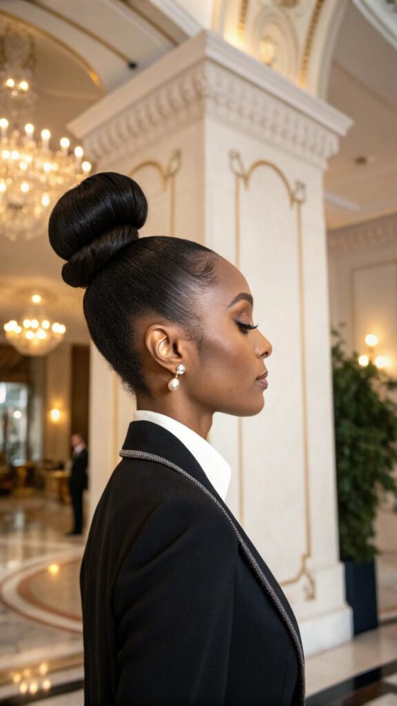 This hairstyle is ideal for those who want a quick and elegant look. Use a satin scrunchie to reduce breakage and maintain hair health. The high bun is a versatile and timeless style.