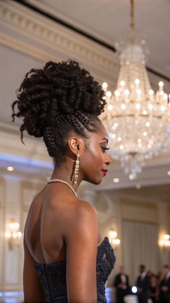 The twisted updo with curls is a glamorous and elegant hairstyle that’s perfect for special occasions. Twist sections of your hair and pin them into an updo, leaving some curls to flow freely. This style is ideal for showcasing your natural texture while looking chic.