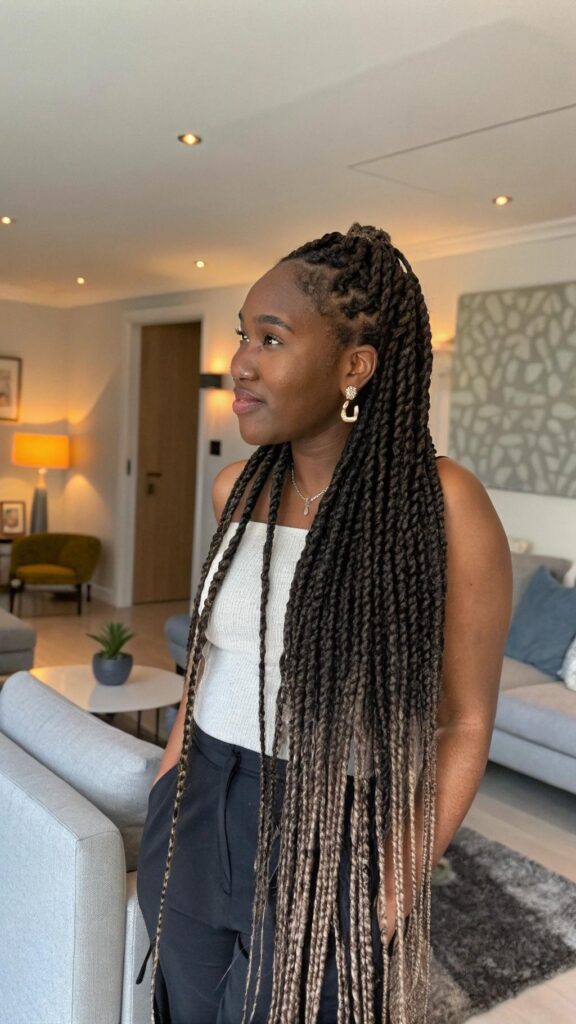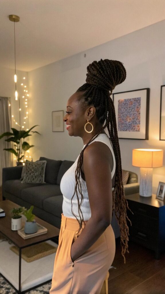 To keep your scalp healthy, moisturize it regularly and avoid braiding too tightly. Box braids are versatile and can be styled in updos, ponytails, or left down for a sleek look. They’re perfect for protecting your natural hair while experimenting with different lengths and colors.
