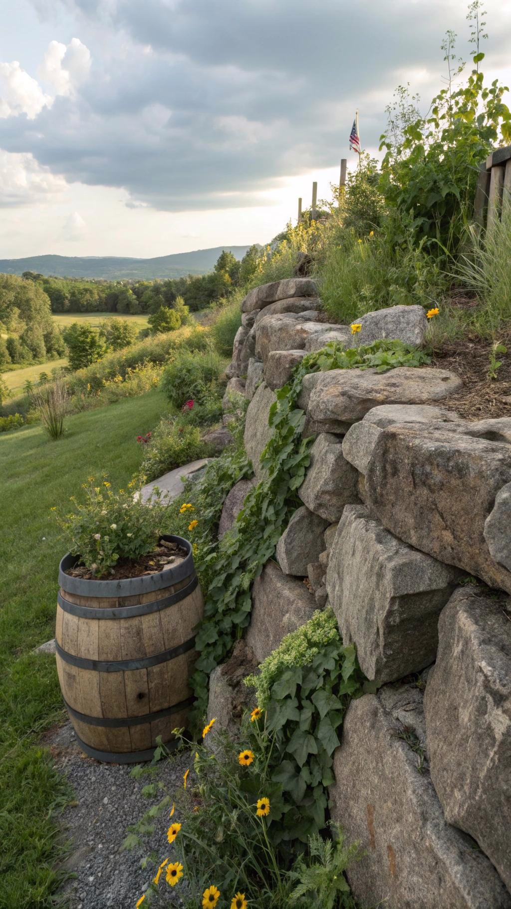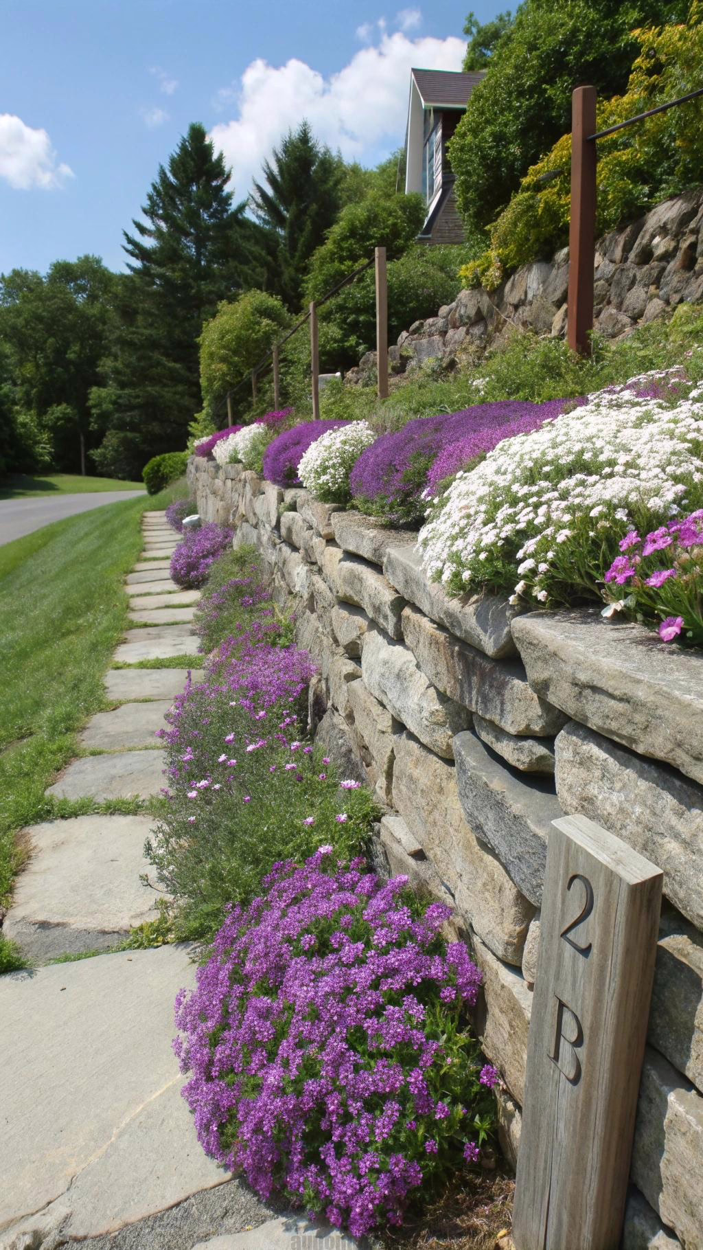 Use local fieldstone for an authentic, organic look. The irregular shapes lock together tightly when properly stacked. Plant drought-resistant varieties like sedum or creeping phlox for low maintenance.