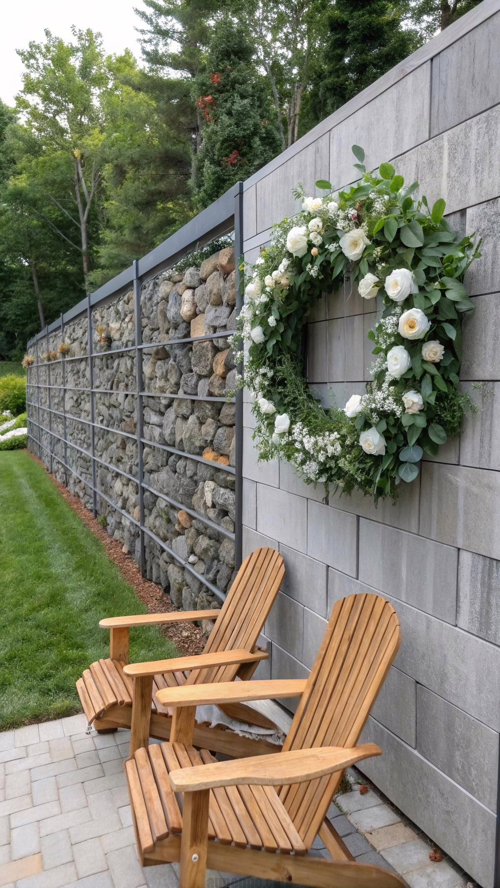 Hang floral wreaths on the gabion frames for wedding decor. The contrast of delicate flowers against rugged stone is striking. Place wooden benches in front for functional seating.