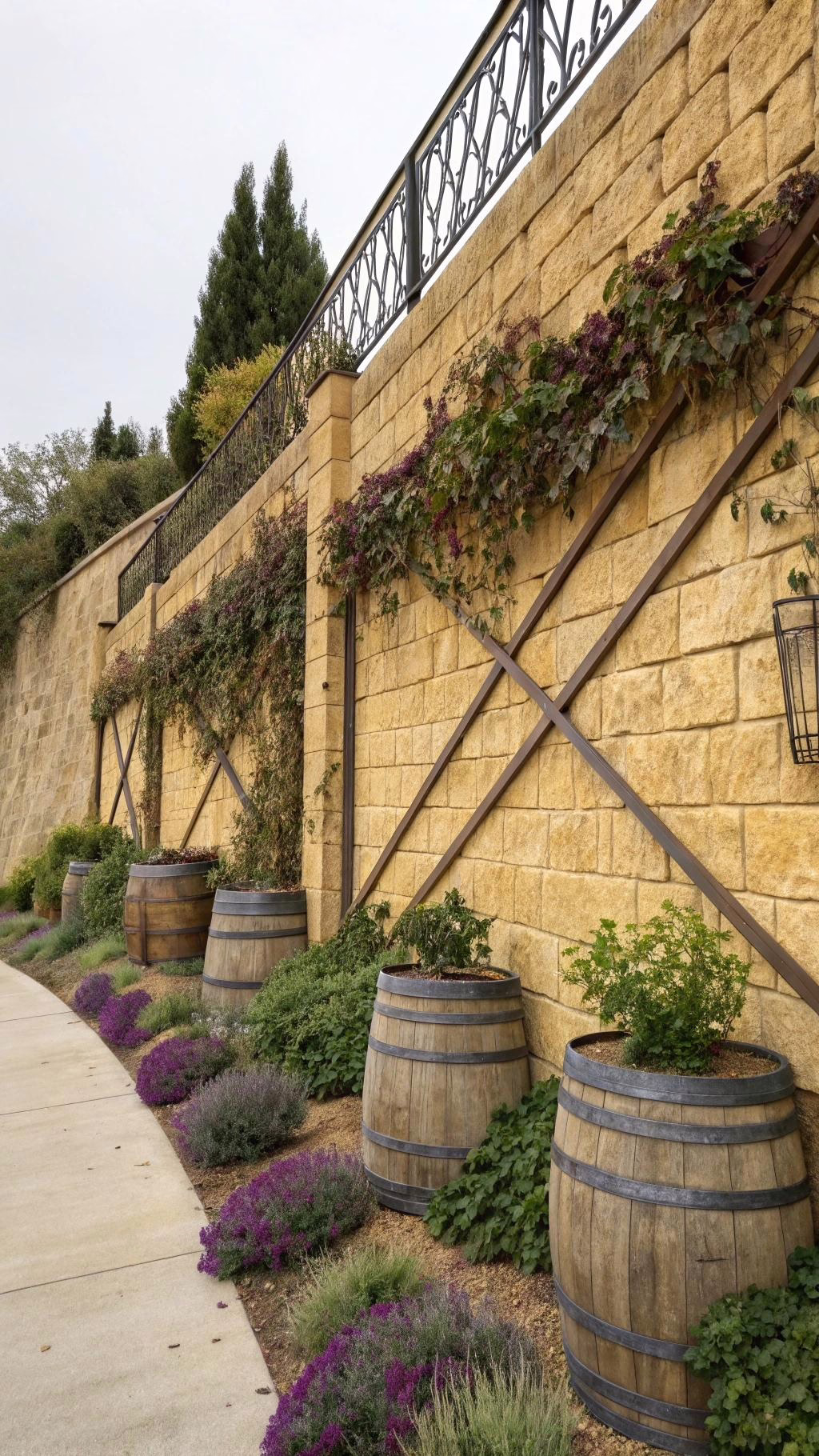 Drape the iron elements with delicate ivy or grapevines. The living greenery softens the metal’s hardness. Place wine barrel planters nearby overflowing with rosemary and lavender.