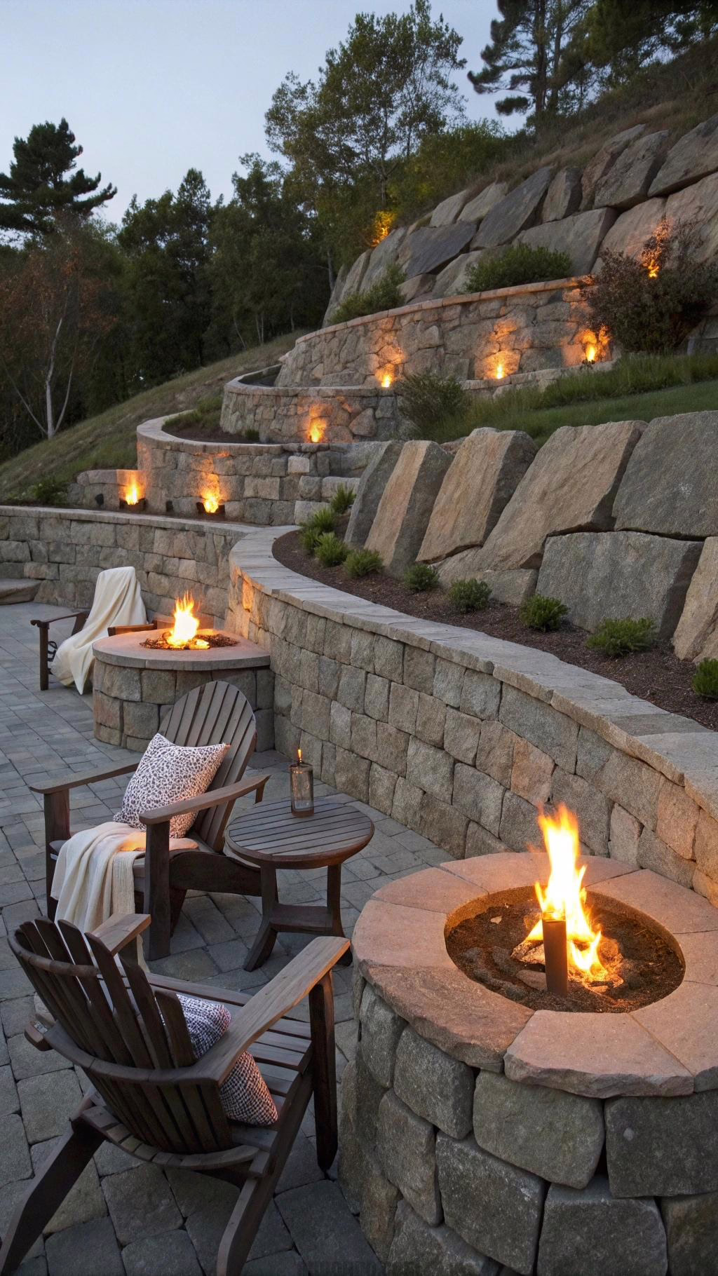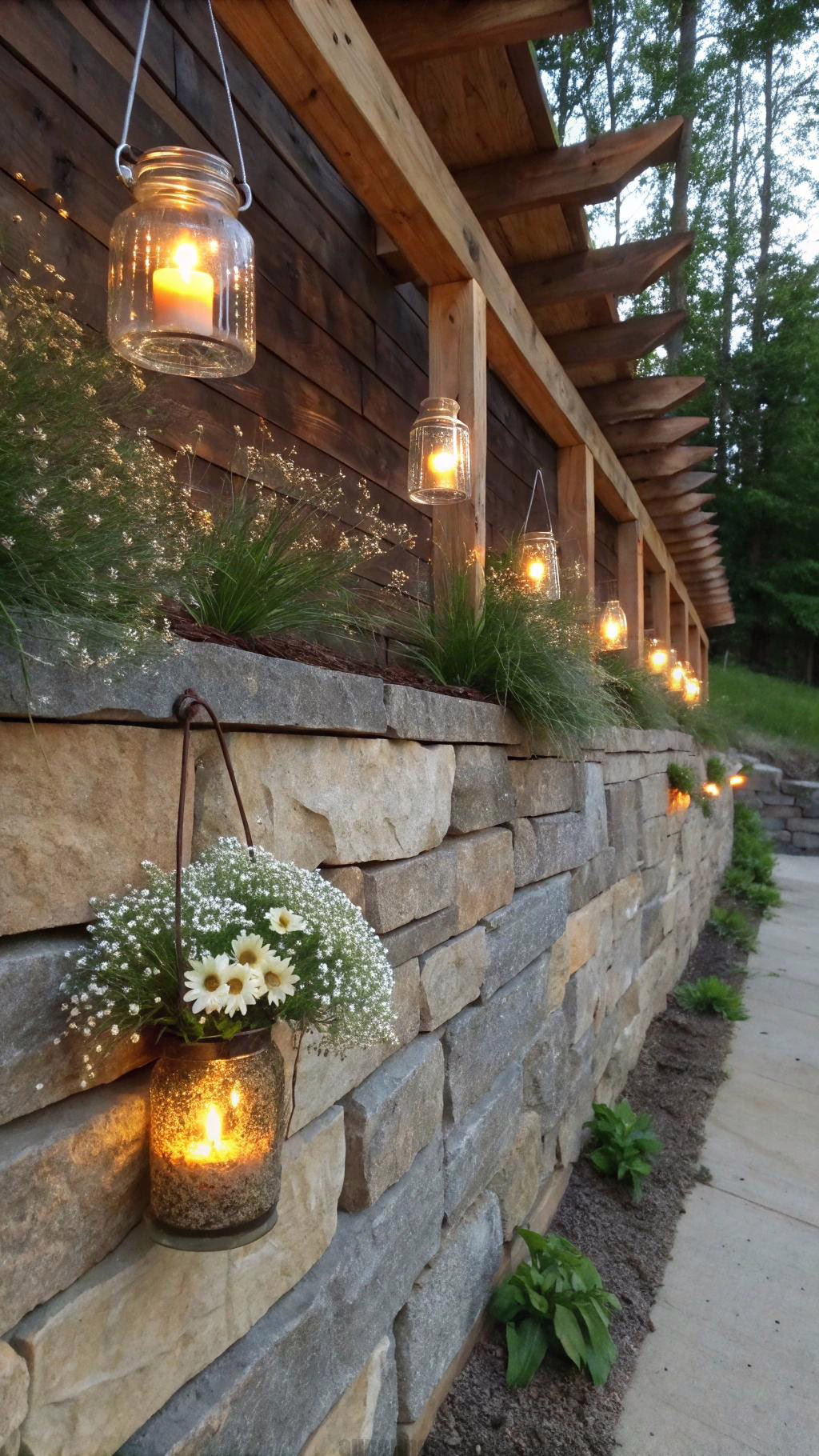 A tiered stone retaining wall creates visual depth in sloped landscapes. The layered design allows for planting flowers or succulents between each level. This idea works well with rustic wedding centerpieces by adding texture and height.