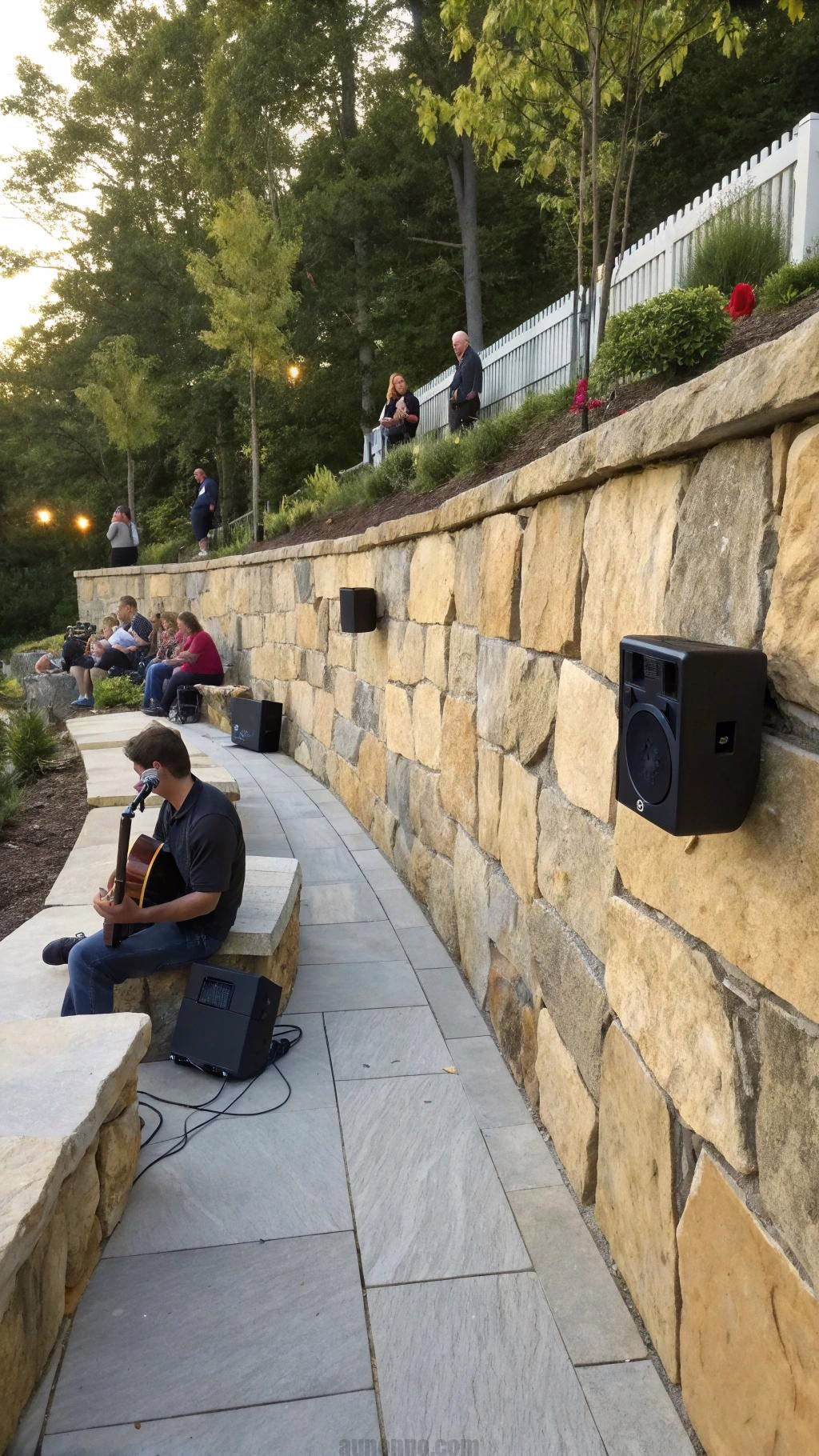 Use weatherproof speakers faced with stone veneer. The technology disappears visually. Position speakers for even sound distribution.