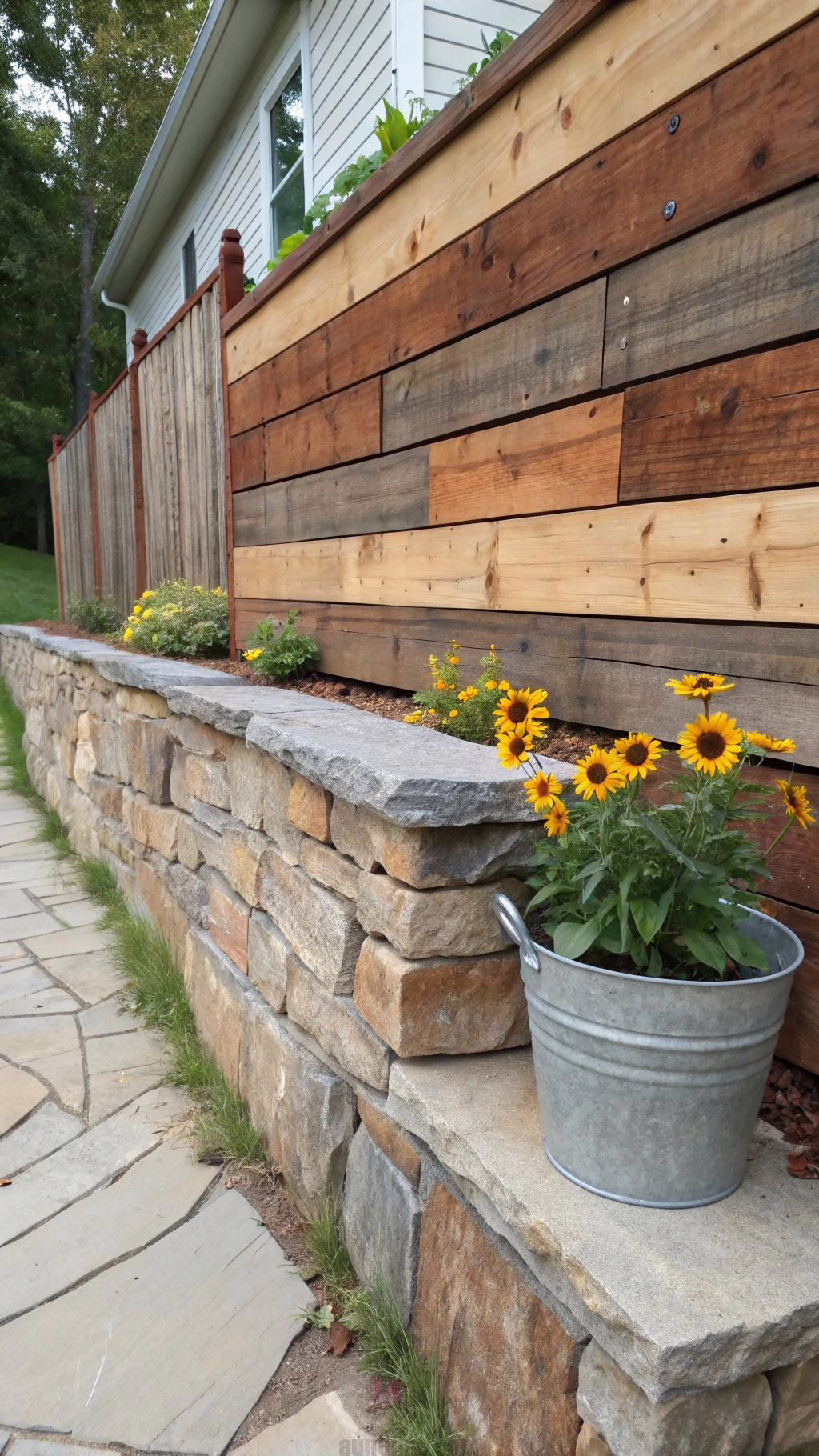 Use stone for the base and reclaimed wood for the upper sections. The warmth of wood balances the coolness of stone. Corrugated metal accents can add an industrial touch.