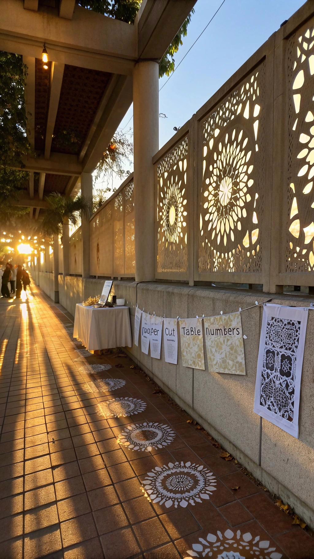 Continue the shadow theme with cut-paper centerpieces. The delicate patterns echo the wall’s effects. Use perforated lanterns to extend the motif after dark.