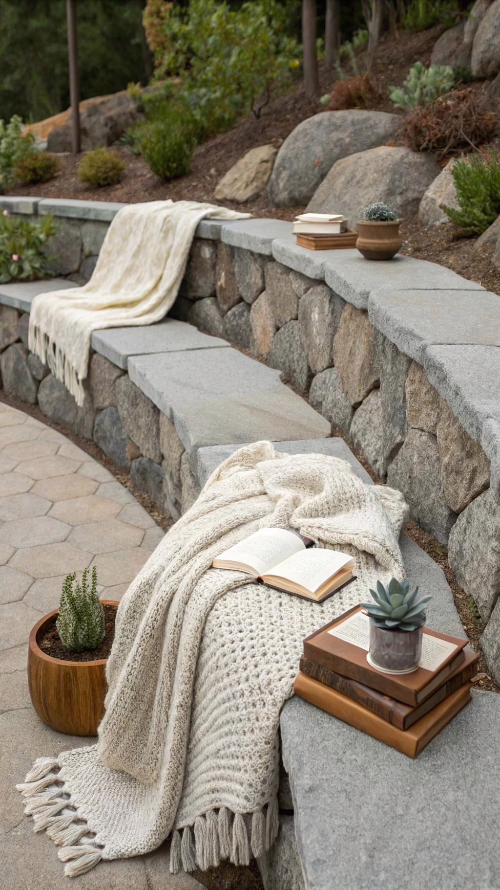 Use the terraces as display areas for potted herbs or candles. The combination of stone and greenery enhances the rustic feel. Add a wooden arbor nearby for a complete wedding setup.
