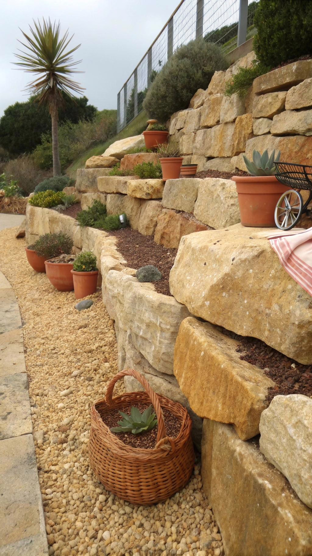 Large boulders surrounded by gravel create a low-maintenance retaining solution. The gravel fills gaps while allowing proper drainage. This design works well for desert or Mediterranean landscapes.
