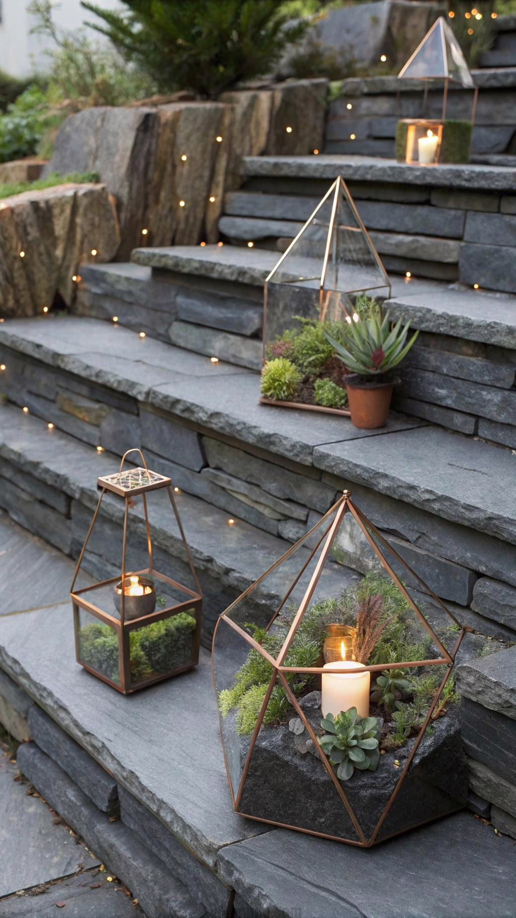 Place glass terrariums with air plants along the wall. The transparent containers keep the focus on the beautiful slate. Add copper lanterns for warm metallic accents.