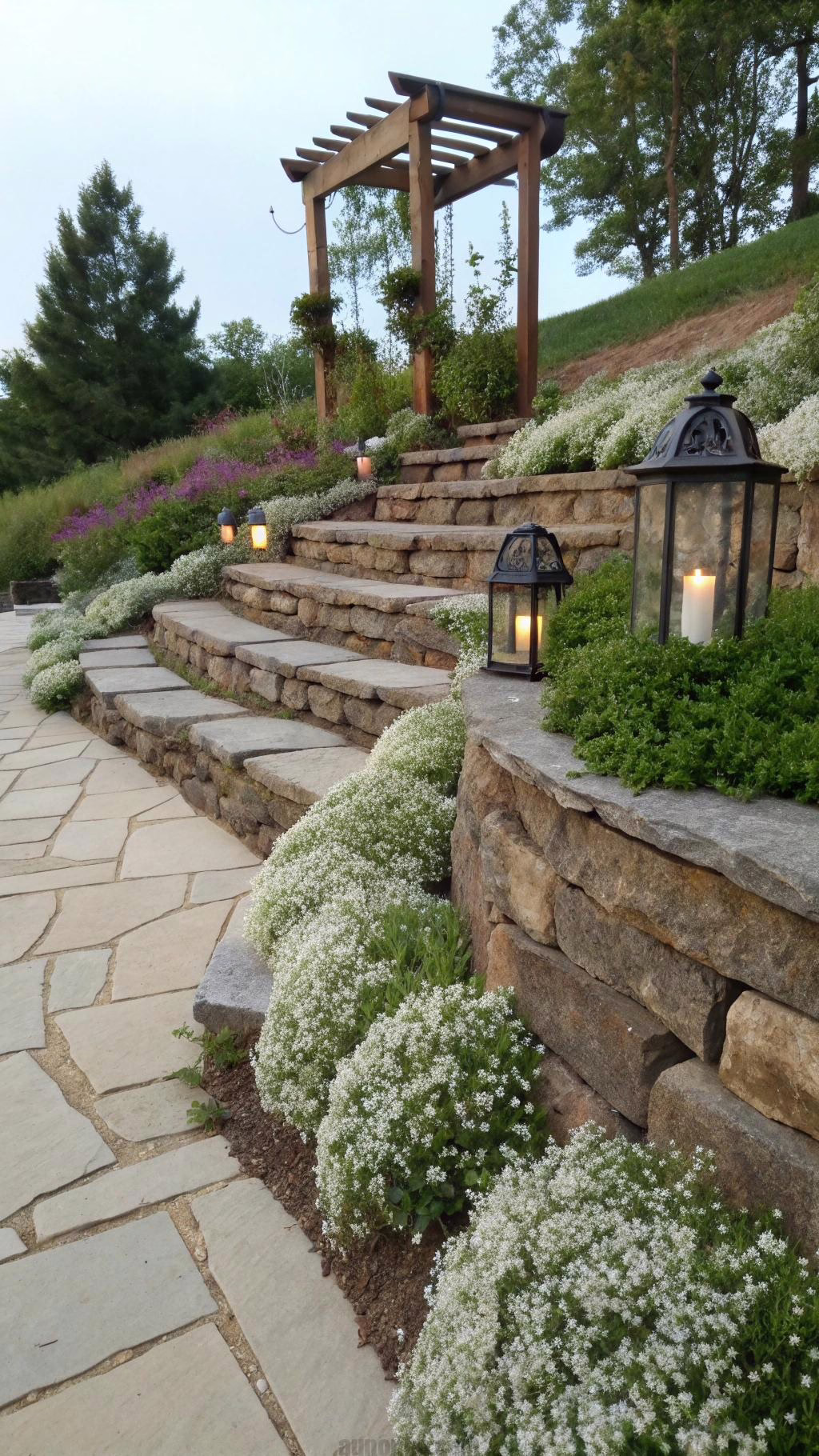 Install the flagstones with slight overlaps for better drainage. The layered effect adds dimension to sloped yards. You can plant cascading flowers between the stones.