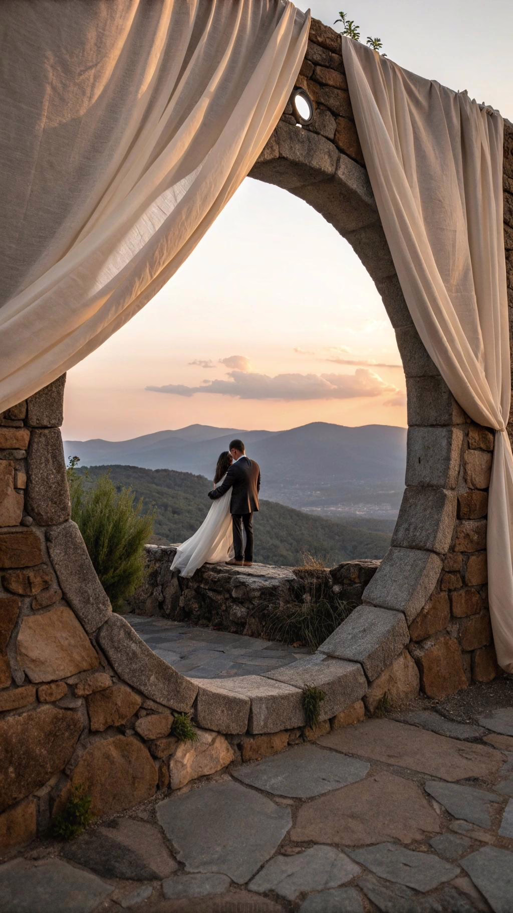 Drape the opening with flowing fabrics for the ceremony. The soft textiles contrast with hard stone. Use the frame for your first kiss as married couple.