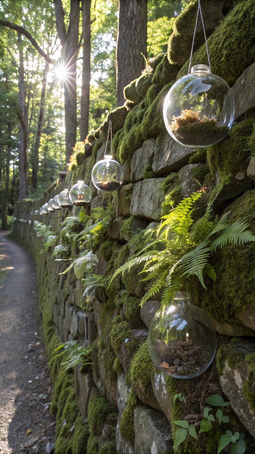 A traditional dry stone wall becomes magical when adorned with hanging glass terrariums. The airy containers seem to float against the solid stone backdrop. This ethereal design enhances romantic rustic weddings.