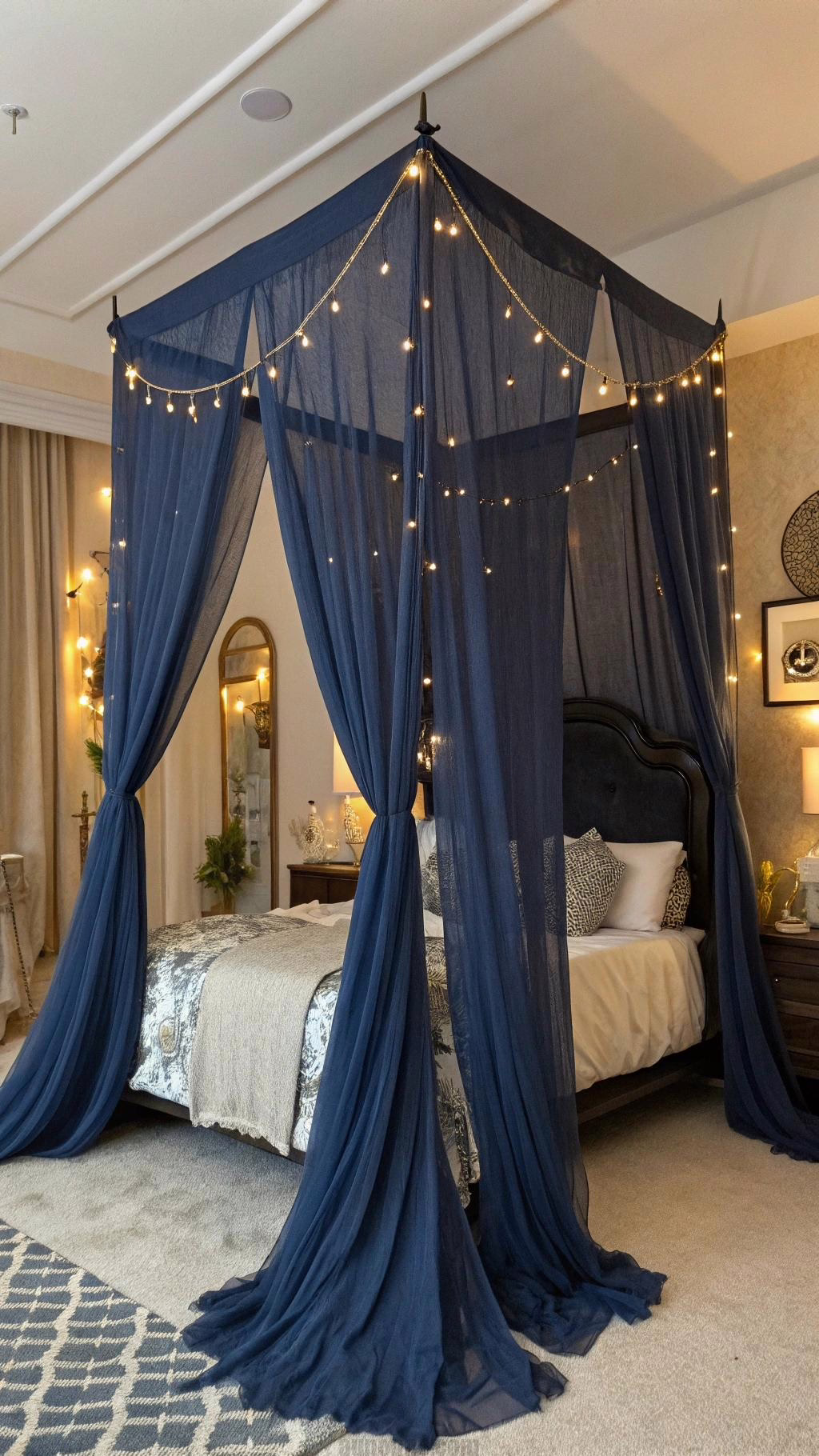 To complement the canopy, incorporate other navy blue elements in your decor, such as bedding or curtains. This will create a cohesive look and make your bedroom feel like a well-designed retreat.