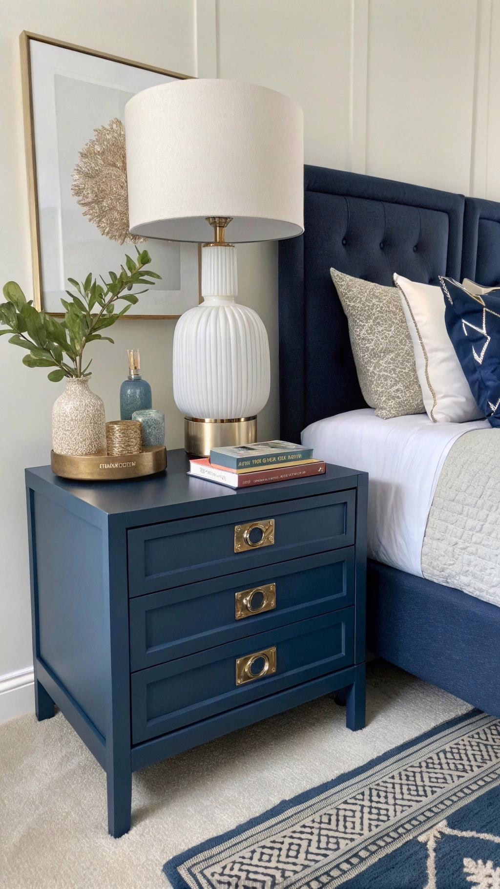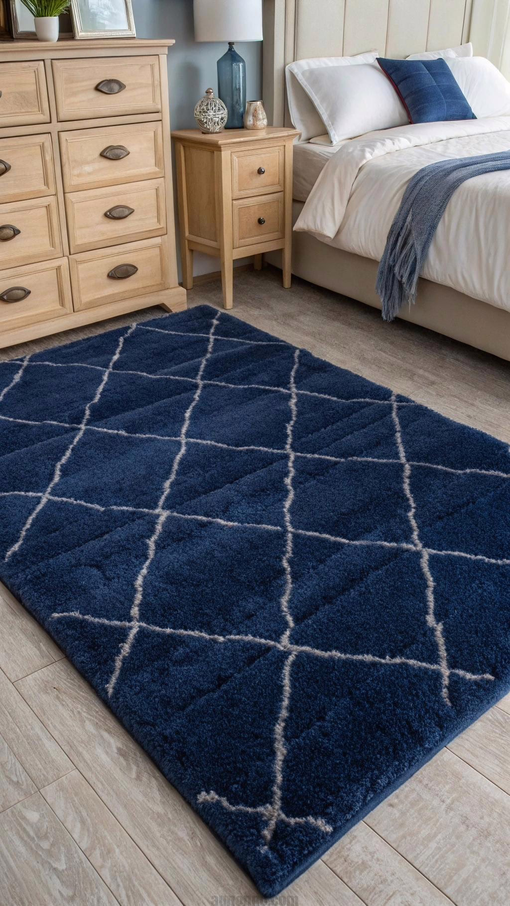 A navy blue rug can anchor your bedroom and add warmth to the space. Choose a plush area rug that feels soft underfoot, making your bedroom feel cozy and inviting. A geometric or patterned rug can add visual interest and complement the navy blue decor.