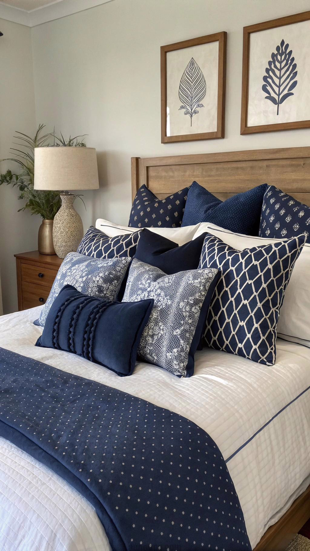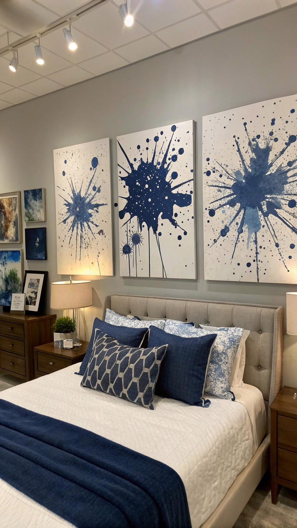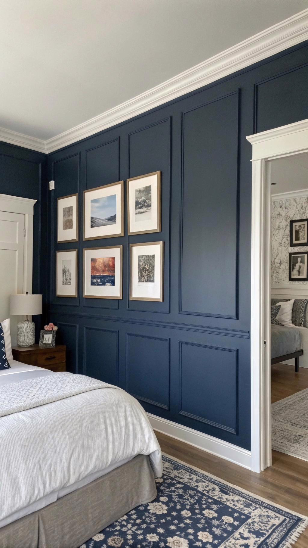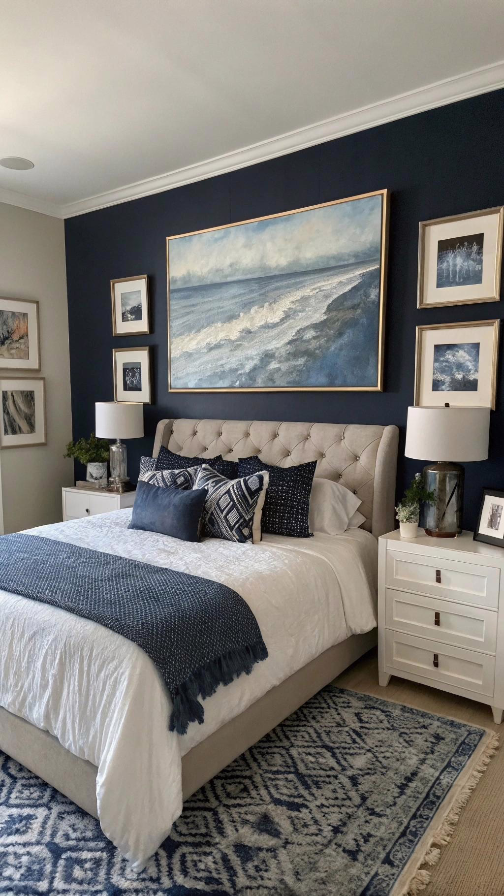 blue as a primary color. Abstract art with splashes of navy can create a modern vibe, while landscapes or seascapes can evoke a sense of tranquility. Hang a large piece above the bed or create a gallery wall with smaller navy-themed artworks to make a bold statement.
