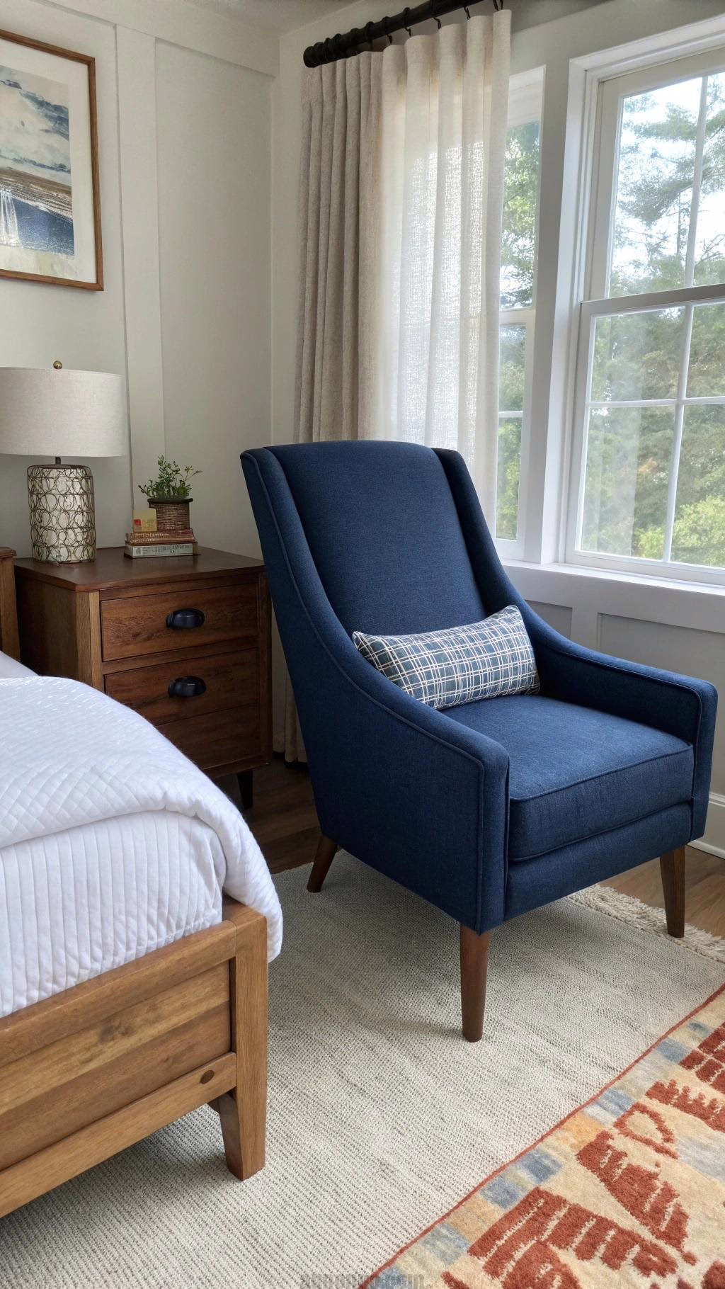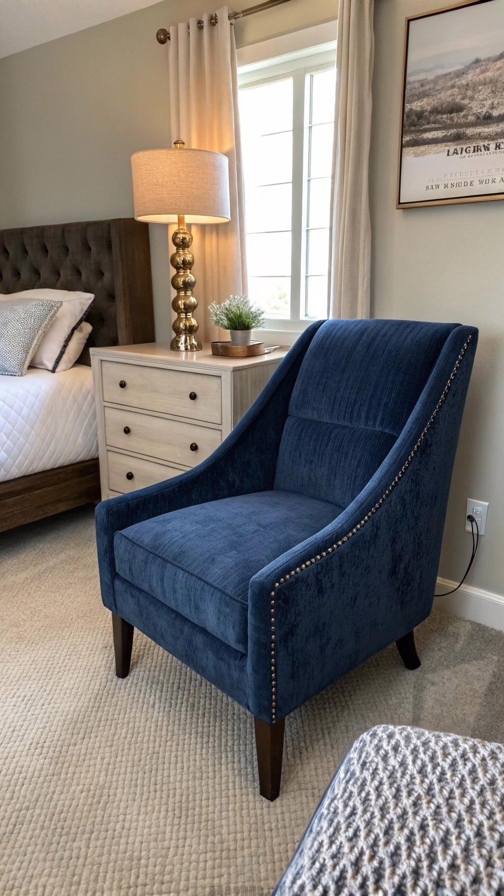 Adding a navy blue accent chair can create a stylish focal point in your bedroom. Choose a chair with a unique design or texture to enhance the overall aesthetic. A plush velvet chair can add a touch of luxury, while a sleek modern chair can create a contemporary vibe.