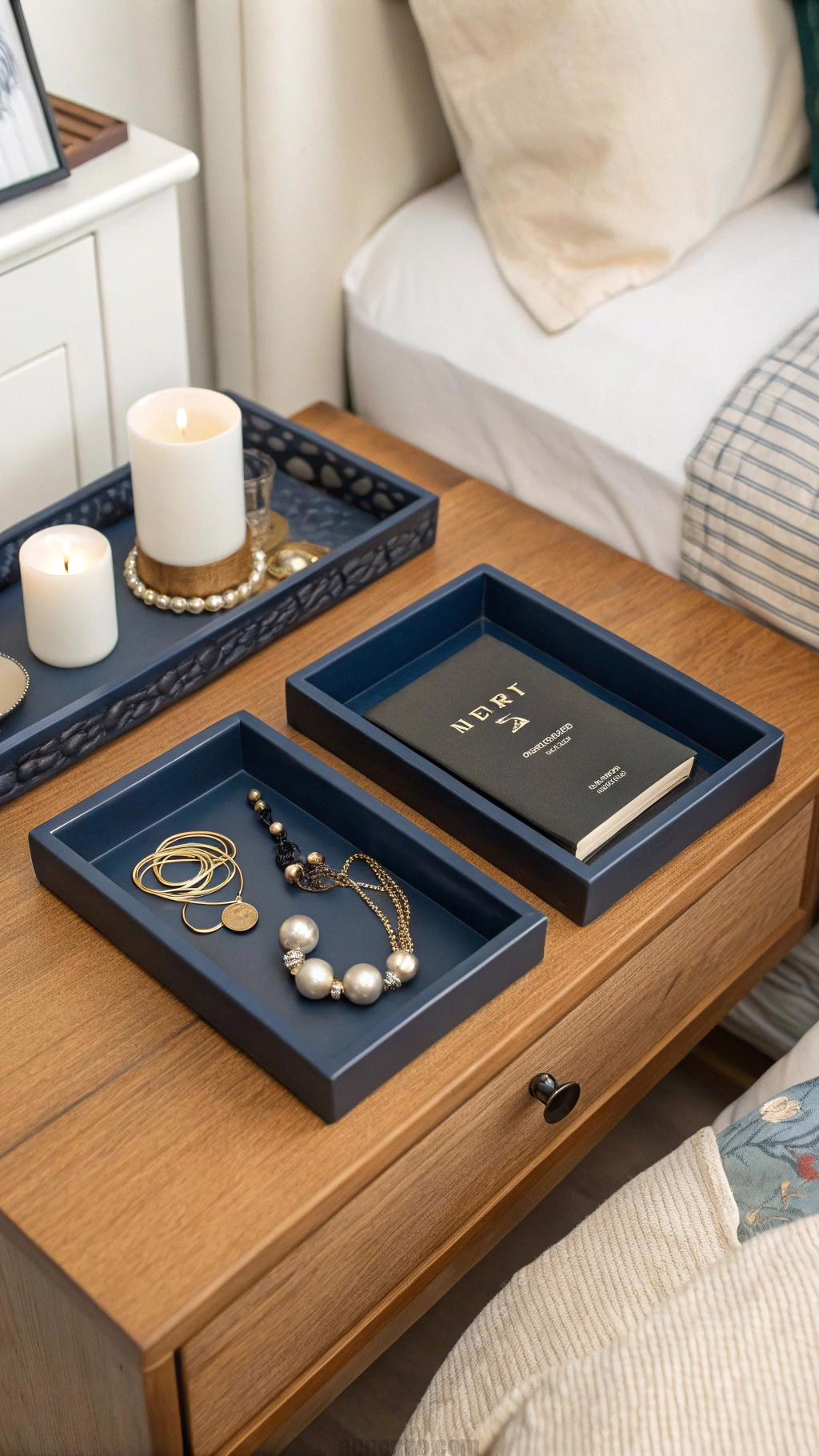 Decorative trays in navy blue can serve as stylish accents in your bedroom. Use them on your nightstand or dresser to organize small items like jewelry, candles, or books. This not only adds functionality but also enhances the overall design of your space.